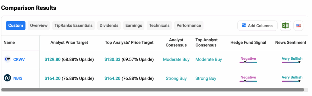 CRWV는 증권가로부터 온건한 매수 의견을 받고 있는 반면, NBIS는 강력 매수 의견을 받고 있다. 129.80달러에서 코어위브의 평균 목표주가는 현재 수준에서 거의 70%의 상승 여력을 시사한다. 이에 비해 NBIS의 목표주가는 164.20달러로 77%의 더 높은 상승 여력을 나타낸다.