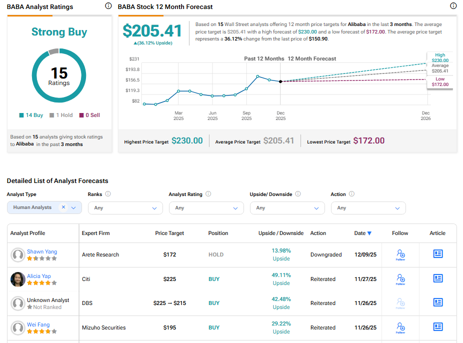이러한 리스크에도 불구하고, 월가는 이 주식에 대해 여전히 긍정적인 입장을 유지하고 있다. 알리바바 주식은 지난 3개월간 매수 14건, 보유 1건을 기록하며 적극 매수 컨센서스 등급을 받고 있다. 평균 BABA 목표주가는 205.41달러로, 현재 수준에서 약 36%의 상승 여력을 시사한다.