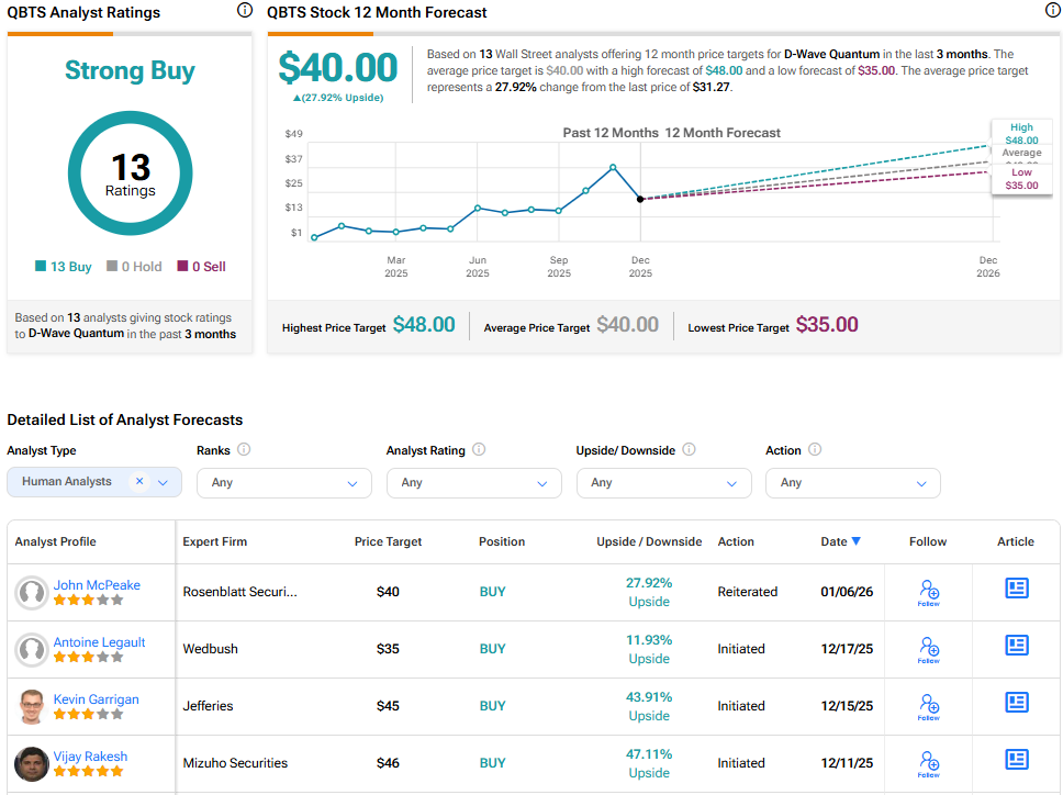 증권가에서 D-Wave는 적극 매수 컨센서스 등급을 보유하고 있다. 평균 QBTS 주가 목표는 40달러로, 현재 가격 대비 27.92% 상승 여력을 시사한다.