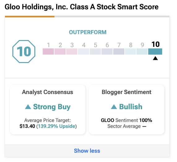 GLOO 주식은 적극 매수 의견을 받고 있으며, 최근 3개월간 5건의 매수 의견이 제시됐다. 글루 홀딩스의 평균 목표주가는 13.40달러로, 140%의 상승 잠재력을 시사한다.
