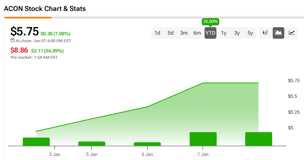 ACON 주식은 목요일 활발한 거래를 보였으며, 약 1,000만 주가 거래됐다. 참고로 이 주식의 3개월 일평균 거래량은 약 27만2,000주다.