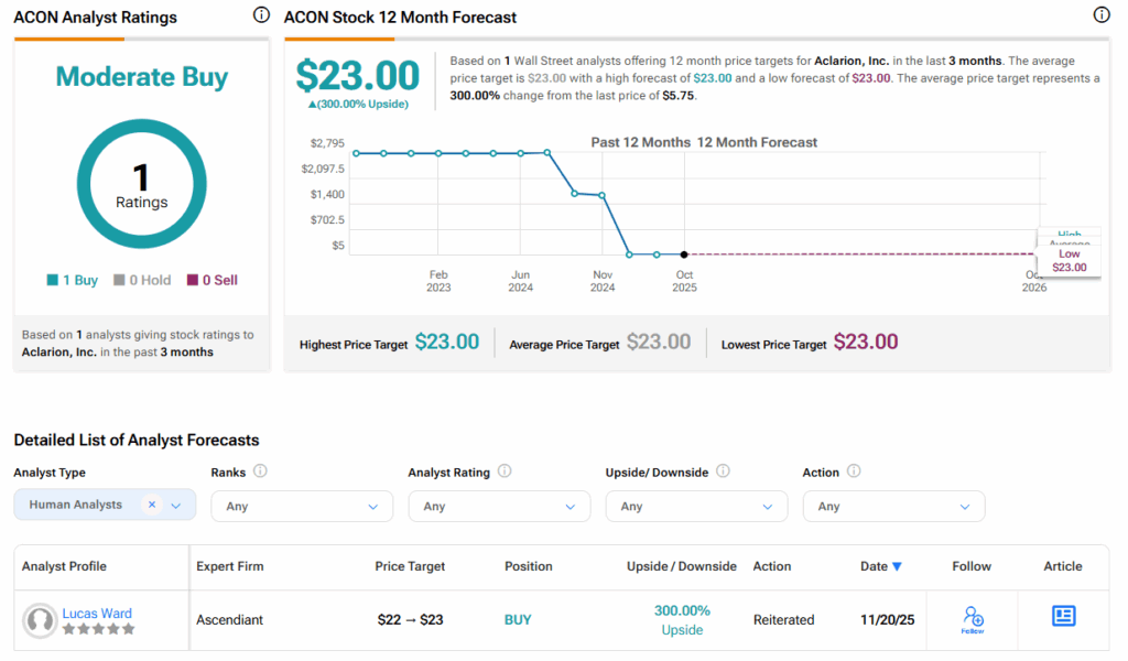 월가를 살펴보면, 액클라리온에 대한 증권가의 컨센서스 등급은 보통 매수다. 지난 3개월 동안 매수 의견 1건을 기반으로 한 것이다. 이와 함께 ACON 주가 목표치는 평균 23달러로, 주가의 잠재적 상승 여력은 300%다.