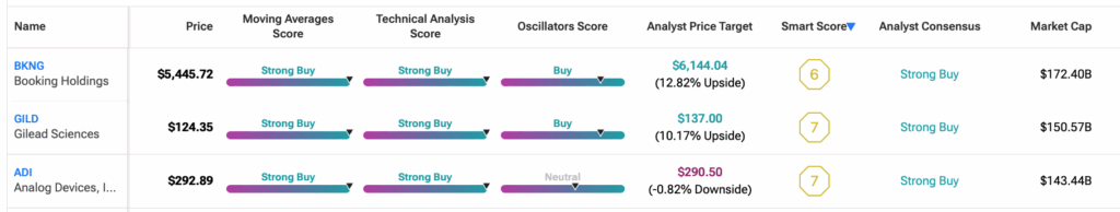 시장이 불안정한 가운데, 기술적 분석은 투자자들이 좋은 주식 기회를 찾는 데 도움을 준다. 팁랭크스의 기술적 분석 스크리너를 활용하여, 현재 강력 매수 신호를 보이고 있는 세 종목을 확인했다. 부킹홀딩스(BKNG), 길리어드 사이언스(GILD), 아날로그 디바이스(ADI)가 그 주인공이다. 이들 종목은 강세 모멘텀을 보이고 있으며, 월가 애널리스트들의 강력 매수 등급에 힘입어 단기에서 중기 상승 잠재력을 제시하고 있다.