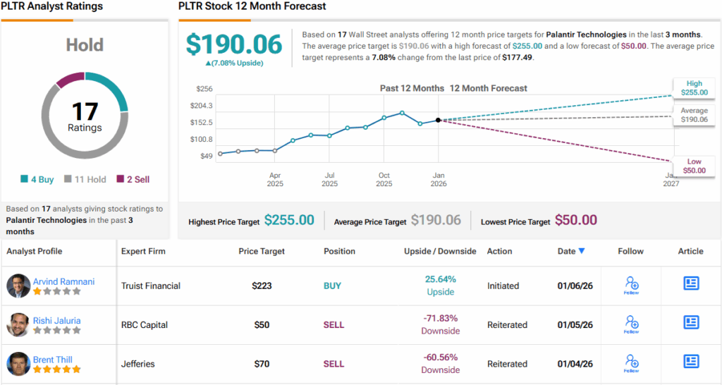 시장도 2026년이 시작되면서 어느 방향으로 바람이 불지 확신하지 못하고 있다. 4개의 매수, 11개의 보유, 2개의 매도 의견으로 PLTR은 컨센서스 보유(즉, 중립) 등급을 받고 있다. 12개월 평균 목표주가 190.06달러는 현재 수준에서 약 7%의 상승 여력을 시사한다. (PLTR 주가 전망 참조)