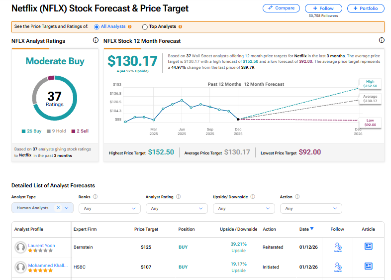 넷플릭스 주식은 월가 애널리스트 37명 사이에서 보통 매수 등급의 컨센서스를 받고 있다. 이 등급은 지난 3개월간 발표된 26건의 매수, 9건의 보유, 2건의 매도 의견을 기반으로 한다. 평균 NFLX 목표주가는 130.17달러로 현재 수준에서 44.97%의 상승 여력을 시사한다.