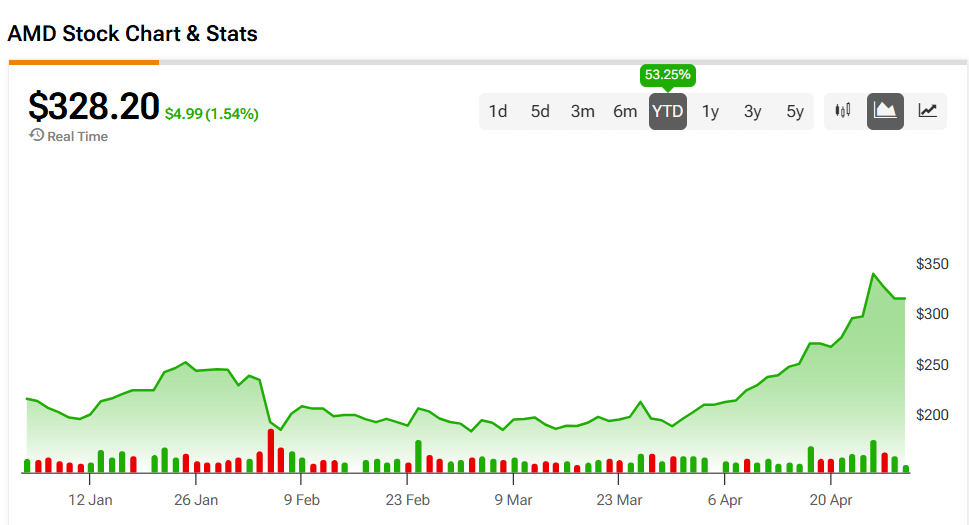 AMD 주식은 수요일 1.54% 상승했으며, 연초 대비 53.25% 상승세를 이어갔다. 주가는 또한 지난 12개월 동안 232.01% 급등했다.