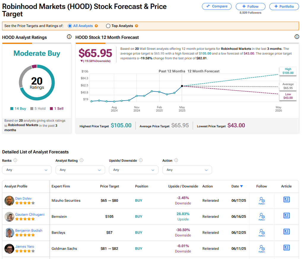 로빈후드 주식에 대해 월가 애널리스트 20명은 '매수 우위' 의견을 제시했다. 이는 최근 3개월간 제시된 14개의 매수, 5개의 보유, 1개의 매도 의견을 종합한 것이다. 로빈후드의 평균 목표주가는 65.95달러로, 현재 주가 대비 19.58%의 하락 여지를 내포하고 있다.