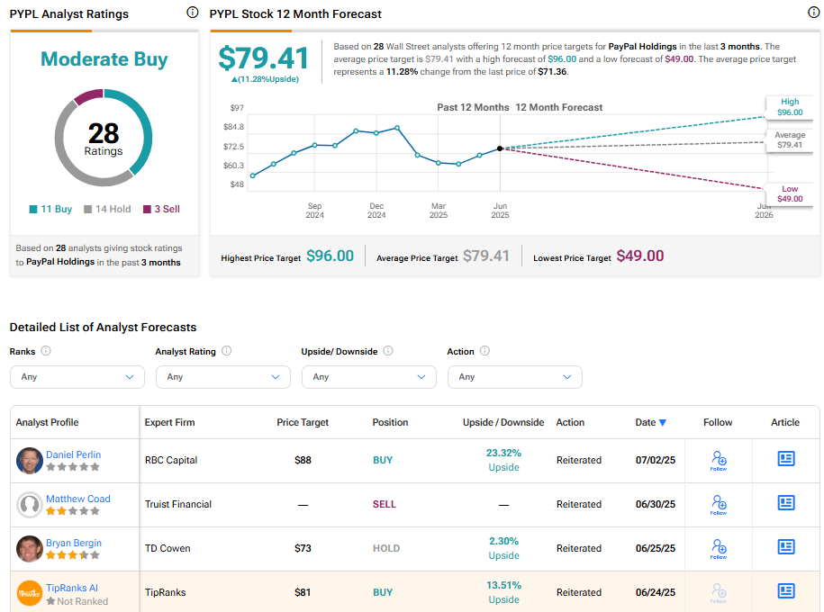 월가는 페이팔 주식에 대해 지난 3개월간 매수 11건, 보유 14건, 매도 3건을 기록하며 '중립적 매수' 의견을 제시했다. 목표주가는 79.41달러로, 현재가 대비 11.28%의 상승여력이 있는 것으로 분석됐다.