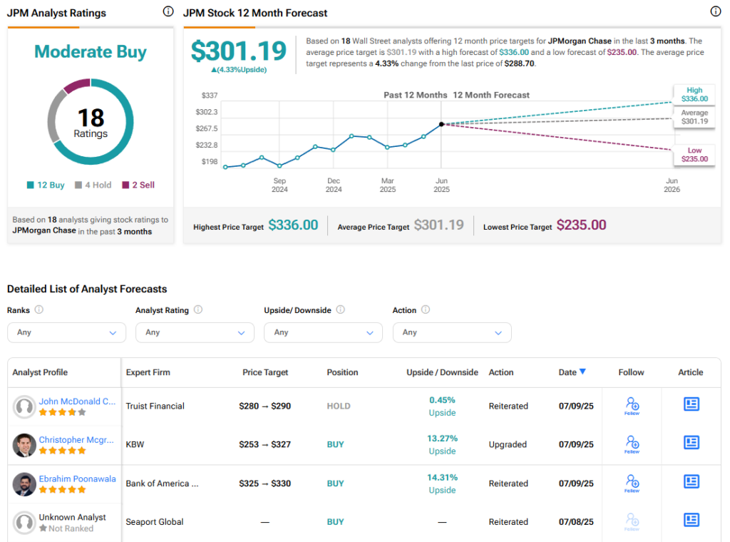월가는 JP모건체이스에 대해 '매수' 의견을 제시했다. 최근 3개월간 매수 12건, 보유 4건, 매도 2건의 의견이 나왔다. 목표주가는 301.19달러로 현재가 대비 4.33%의 상승여력을 제시했다. 다만 이번 실적 발표 이후 애널리스트들의 투자의견과 목표주가는 변경될 수 있다.