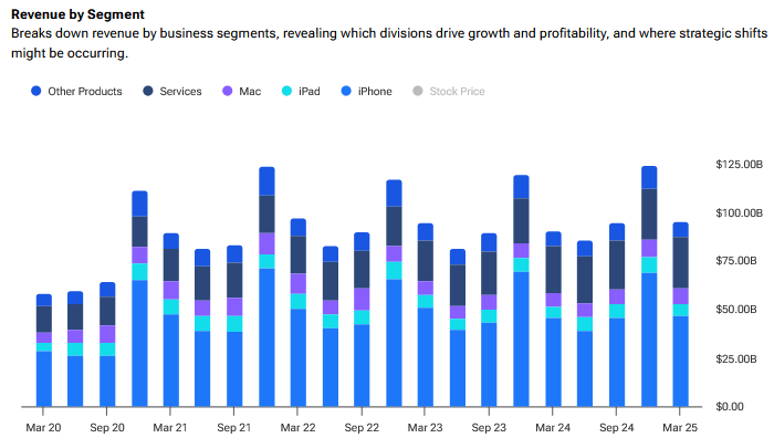 아래 그래프에서 볼 수 있듯이 아이폰은 여전히 애플의 핵심 수익원이다.
