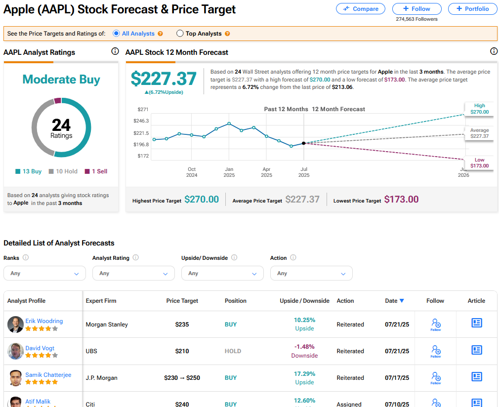 팁랭크스에 따르면 애플에 대한 월가의 투자의견은 '매수' 13건, '보유' 10건, '매도' 1건으로 종합의견 '중립적 매수'다. 최고 목표가는 270달러이며, 컨센서스 목표가는 227.37달러로 현재가 대비 6.71%의 상승여력을 제시했다.