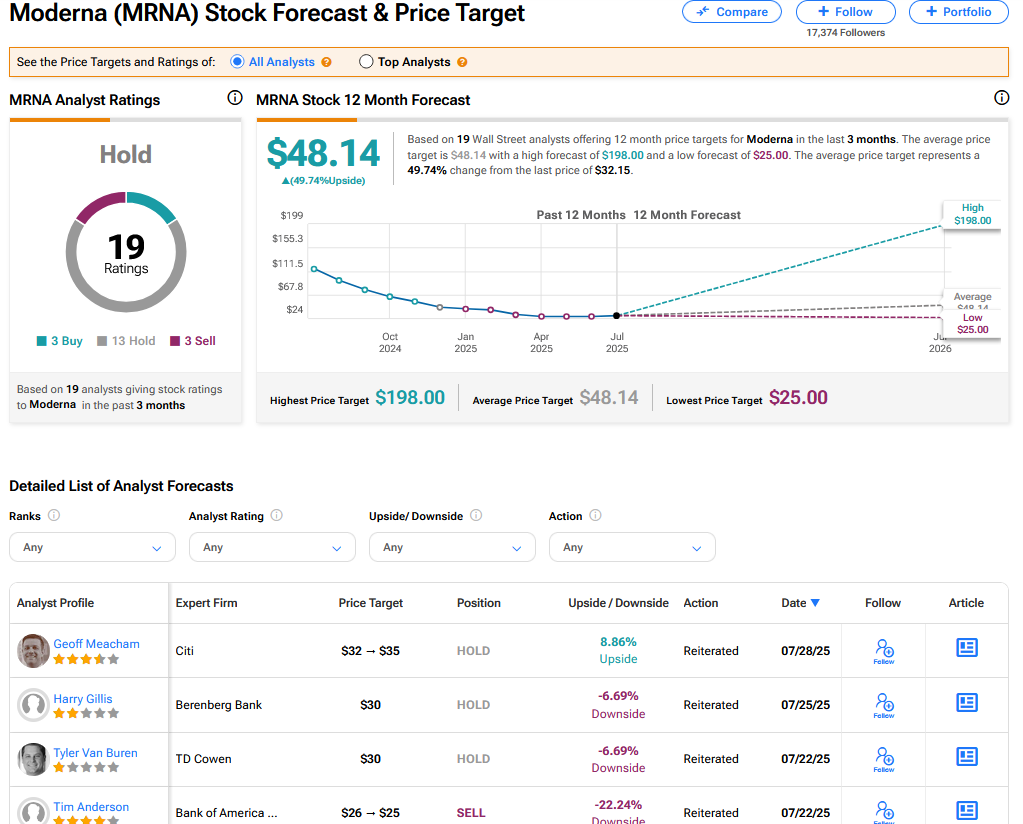팁랭크스에 따르면 모더나는 매수 3개, 보유 13개, 매도 3개의 의견을 받아 종합 '보유' 의견을 기록했다. 최고 목표가는 198달러다. 컨센서스 목표가는 48.14달러로 49.74%의 상승여력을 시사한다.