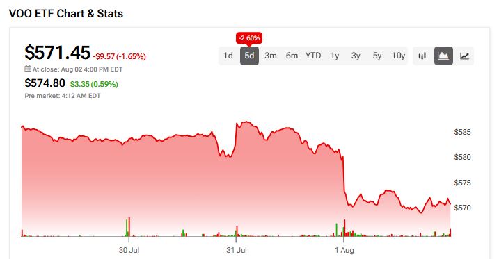 뱅가드 S&P500 ETF(VOO)가 최근 5일간 2.60% 하락했으나, 연초 대비로는 6.75% 상승세를 보이고 있다.