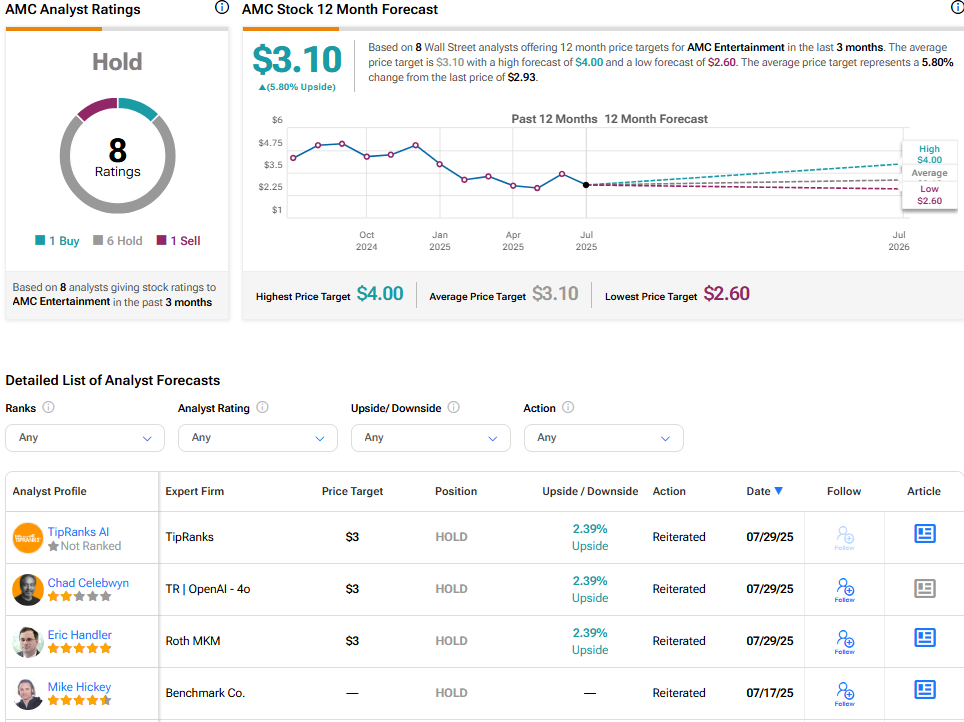 AMC엔터테인먼트홀딩스(AMC)가 2025년 2분기 실적이 월가 예상치를 상회하며 주가가 11% 급등했다. 증권가는 AMC에 대해 보유 의견과 목표주가 3.10달러를 제시하며 신중한 입장을 유지하고 있다.