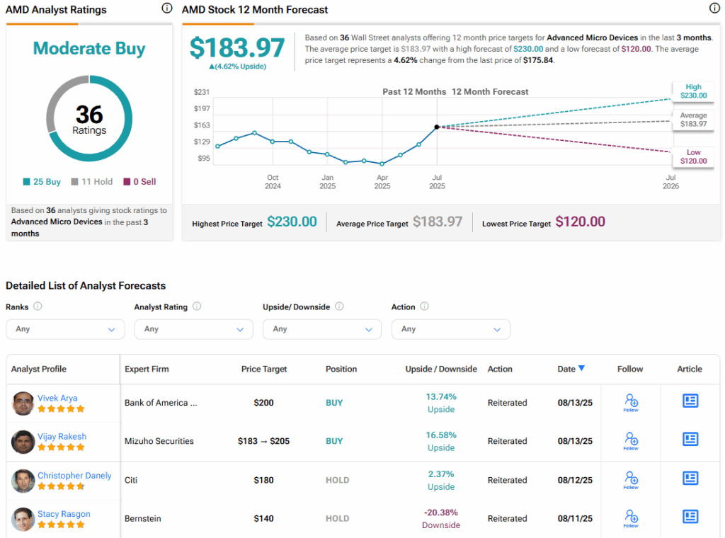 월가는 AMD에 대해 '매수' 의견을 제시하고 있다. 최근 3개월간 제시된 투자의견을 보면 매수 25건, 보유 11건이다. 월가가 제시한 AMD의 평균 목표주가는 183.97달러로, 현재가 대비 4.62%의 상승여력이 있는 것으로 분석됐다.
