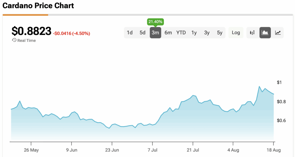 카르다노(ADA-USD) 가격이 8월 들어 상승세를 보이며 최대 37%까지 올랐다가 일부 조정을 받았다. 현재 관건은 2024년 12월 이후 강력한 저항선으로 작용해온 1달러 선을 돌파할 수 있느냐다.
