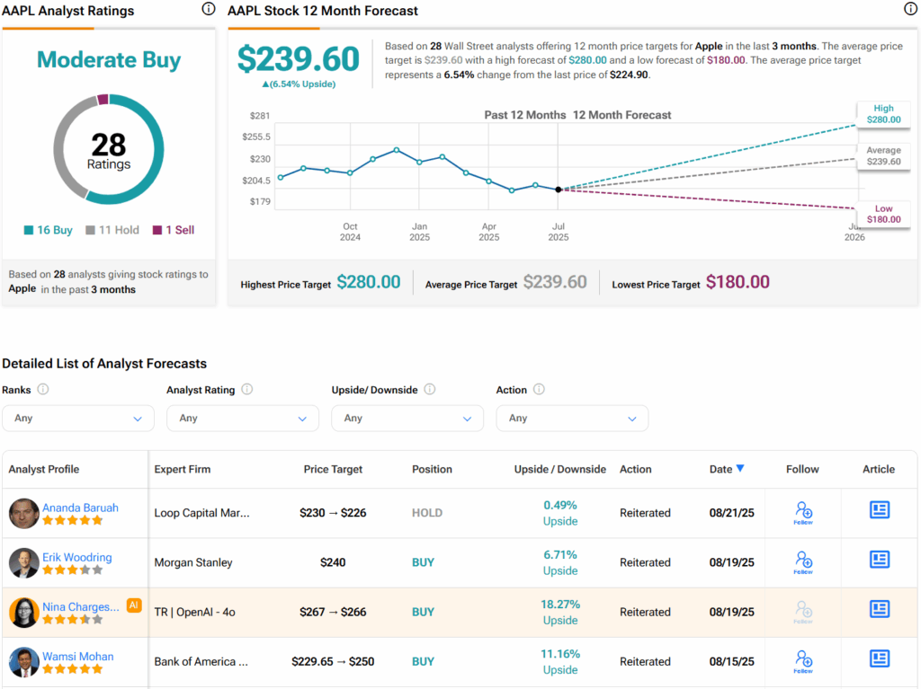 월가는 애플 주식에 대해 지난 3개월간 매수 의견 16건, 보유 의견 11건, 매도 의견 1건을 제시하며 '매수' 쪽에 무게를 두고 있다. 애플의 주가 목표치는 239.60달러로, 현재 주가 대비 6.5%의 상승 여력이 있는 것으로 분석된다.