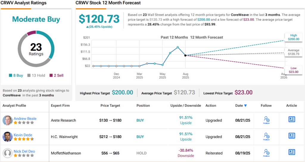 월가는 전반적으로 코어위브에 대해 신중하면서도 긍정적인 입장이다. 현재 8개의 매수, 13개의 보유, 2개의 매도 의견이 제시되어 있으며, 투자의견 합의는 '중립적 매수'다. 애널리스트들의 12개월 평균 목표가는 120.73달러로, 현재가 대비 약 28%의 상승여력을 시사한다.