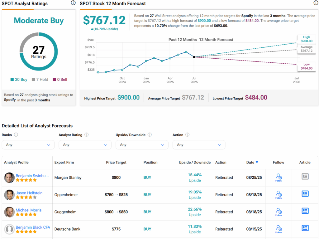 월가는 스포티파이 주식에 대해 지난 3개월간 매수 20건, 보유 7건, 매도 1건을 기록하며 '매수' 의견을 제시했다. 주가 목표치는 767.12달러로, 현재 가격 대비 10.7%의 상승 여력이 있는 것으로 분석됐다.