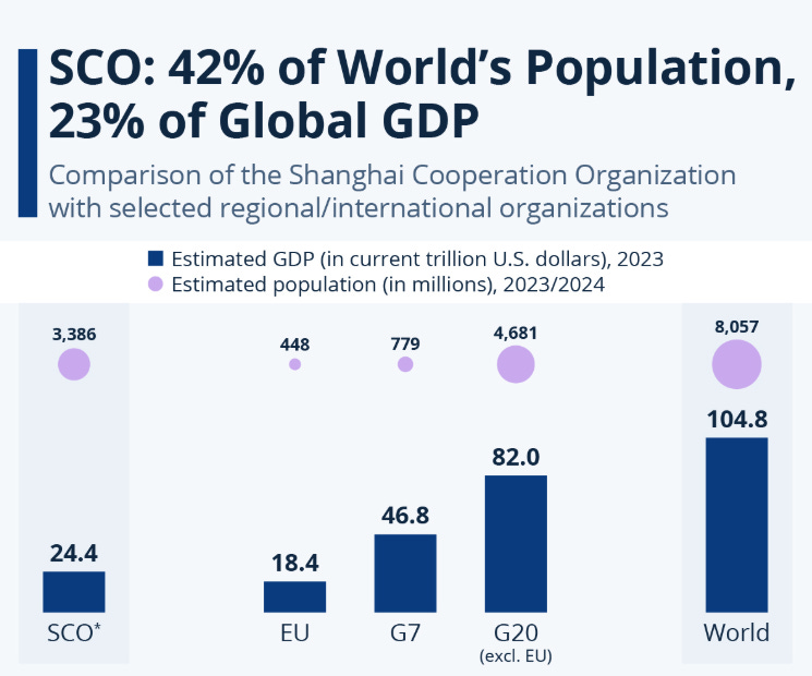 SCO 10개 회원국의 2023년 국내총생산(GDP) 합계는 24.4조 달러로 전 세계 GDP의 23%를 차지했다. 이는 EU보다 약 6조 달러 많은 규모다. 비교하면 G7은 세계 경제 생산의 45%를 차지했다.