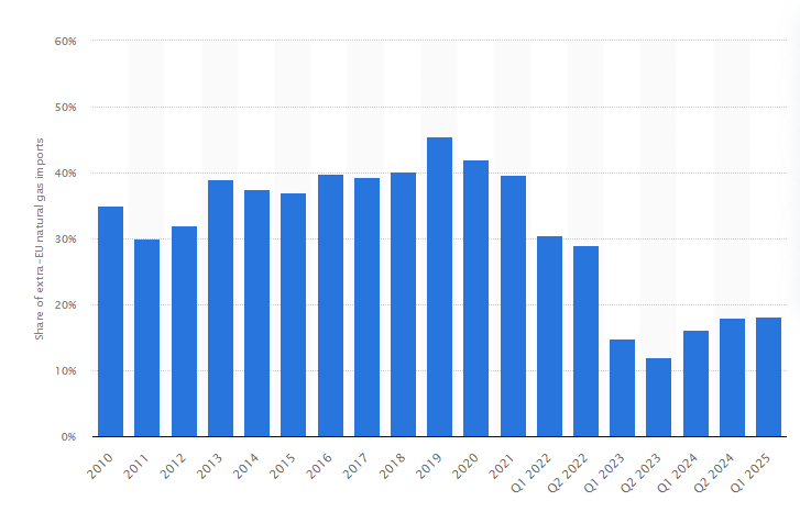 한편 EIA에 따르면 러시아의 EU 가스 수출은 2020년에서 2024년 사이 3분의 2 이상 감소했다. EU는 2027년까지 러시아산 석유와 가스 수입을 단계적으로 중단할 계획이다.