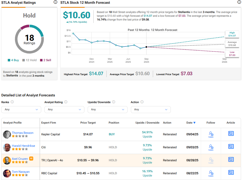 스텔란티스에 대한 월가의 의견은 여전히 엇갈리며 투자의견 합의는 '보유'다. 최근 18개의 투자의견 중 매수 4개, 보유 12개, 매도 2개가 제시됐다. 스텔란티스의 평균 목표주가는 10.60달러로, 현재가 대비 16.74%의 상승여력을 제시하고 있다.