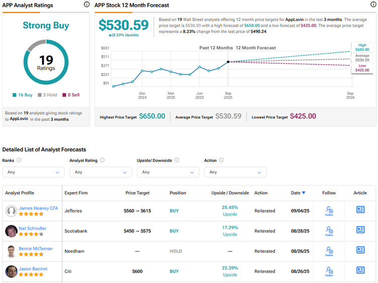 대부분의 애널리스트들이 히니의 낙관적 전망에 동의하고 있다. 증권가는 앱러빈 주식에 대해 16개의 매수와 3개의 보유 의견을 바탕으로 '강력 매수' 의견을 제시했다. 앱러빈 주식의 평균 목표가는 530.59달러로, 현재 주가 대비 8.2%의 상승 여력을 시사한다.