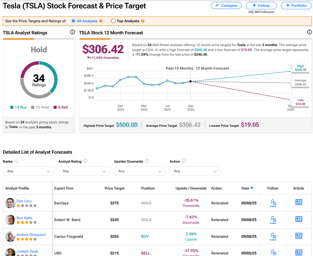 팁랭크스에 따르면 테슬라는 매수 13건, 보유 13건, 매도 8건으로 보유 의견이 우세하다. 최고 목표가는 500달러다. 현재 컨센서스 목표가는 306.42달러로, 현재가 대비 11.54% 하락 여력이 있는 것으로 분석된다.