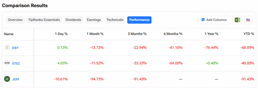 팁랭크스 주식비교 도구에 따르면, 빅트리 클라우드 홀딩스, 산테크 홀딩스, 707 케이맨 홀딩스의 실적을 비교해볼 수 있다. 이들 기업 모두 2025년 들어 큰 폭의 하락을 기록하며 부진한 성과를 보였다.