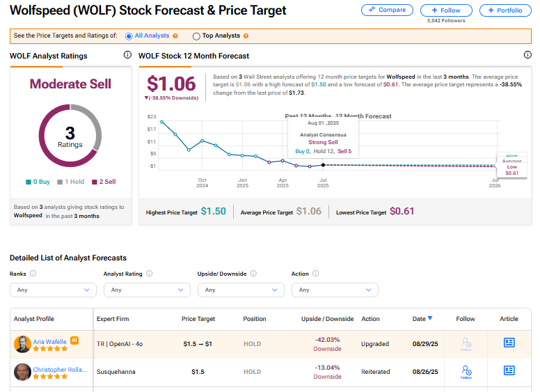 월가 애널리스트 3명의 컨센서스는 '비중축소'다. 이는 최근 3개월간 홀드 1건, 매도 2건의 투자의견을 기반으로 한다. 울프스피드의 평균 목표주가는 1.06달러로, 현재 주가 대비 38.55%의 하락 여지를 암시한다.