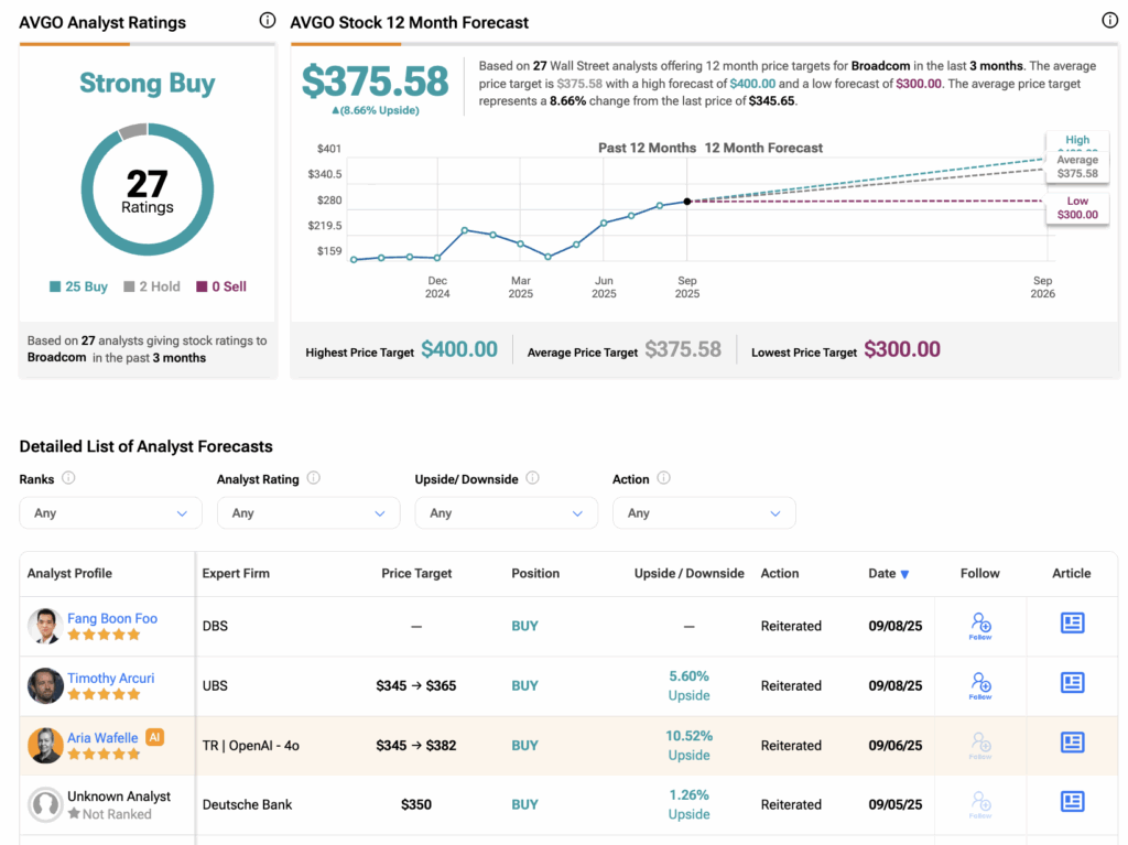월가는 브로드컴에 대해 최근 3개월간 제시된 27개의 투자의견 중 25개가 매수, 2개가 보유로, 강력매수 의견을 제시하고 있다. 브로드컴의 평균 목표주가는 375.58달러로, 현재 주가 대비 8.6%의 상승여력을 시사한다.