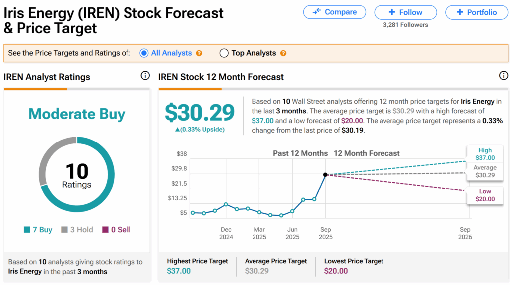 IREN의 평균 목표주가는 30.29달러로, 현재 주가 대비 0.33%의 상승 여력을 시사한다.