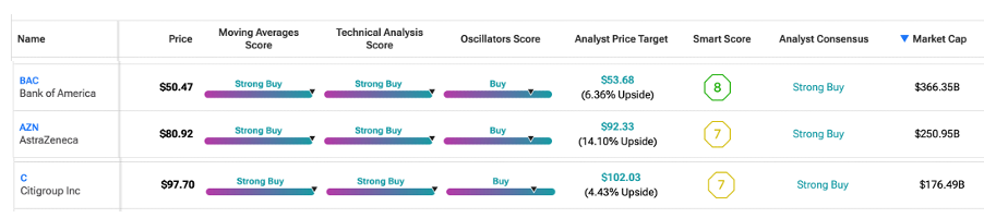 시장이 불안정한 가운데 기술적 분석을 통해 유망 종목을 찾아보았다. 팁랭크스의 기술적 분석 스크리너를 활용한 결과, 뱅크오브아메리카(BAC), 아스트라제네카(AZN), 씨티그룹(C) 등 3개 종목이 강력 매수 신호를 보이고 있다. 이들 종목은 강세 모멘텀을 보이고 있으며, 월가도 강력 매수 의견을 제시하며 단기 및 중기 상승 가능성을 점치고 있다.