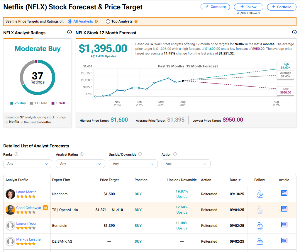 월가 애널리스트 37명의 넷플릭스 투자의견은 '매수 우위'다. 최근 3개월간 매수 25건, 보유 11건, 매도 1건의 의견이 제시됐다. 목표주가 평균은 1,395달러로, 현재 주가 대비 11.48%의 상승여력이 있는 것으로 분석됐다.