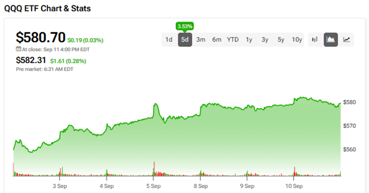 인베스코 QQQ ETF가 최근 5일간 3.5% 상승했으며, 연초 대비 약 13.8% 상승한 것으로 나타났다.