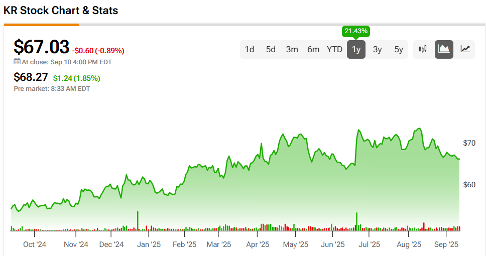 슈퍼마켓 체인 크로거의 2025 회계연도 2분기 실적 발표 후 목요일 주가가 상승했다. 주당순이익(EPS)은 1.04달러를 기록해 월가 예상치 99센트를 상회했다. 이는 전년 동기 93센트 대비 11.8% 증가한 수치다.