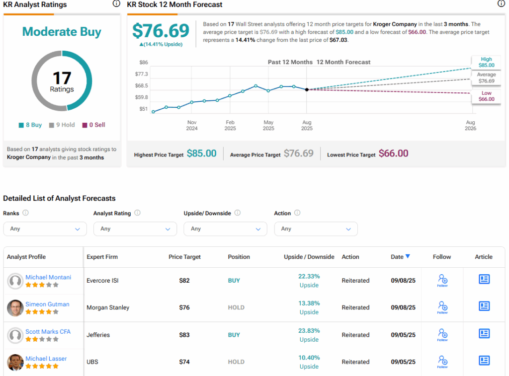 월가는 크로거에 대해 지난 3개월간 매수 8건, 보유 9건을 제시해 '매수 우위' 의견을 유지했다. 평균 목표주가는 76.69달러로 현재가 대비 14.41%의 상승여력을 제시했다. 이번 실적 발표 이후 애널리스트들의 투자의견과 목표가는 조정될 것으로 예상된다.
