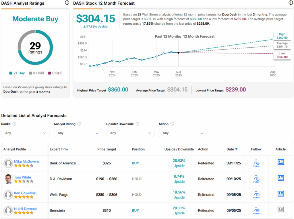 월가는 도어대시 주식에 대해 지난 3개월간 21건의 매수, 8건의 보유, 0건의 매도 의견을 제시하며 '매수 우위' 의견을 유지하고 있다. 도어대시의 주당 목표주가는 304.15달러로, 현재 주가 대비 17.9%의 상승 여력이 있는 것으로 분석된다.