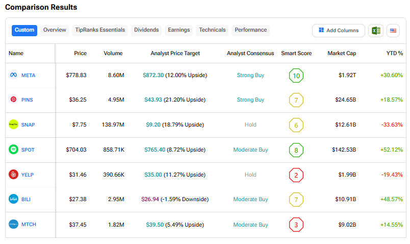 소셜미디어 섹터 투자에 관심 있는 투자자들을 위해 팁랭크스 주식비교 도구를 사용해 최고의 투자 종목을 선별했다. 증권가는 메타플랫폼스(META)와 핀터레스트(PINS)에 대해 가장 낙관적인 전망을 보이며, 두 종목 모두 '강력 매수' 등급을 받았다. 이 중 핀터레스트가 현재 주가 대비 가장 높은 상승 잠재력을 보유하고 있다.