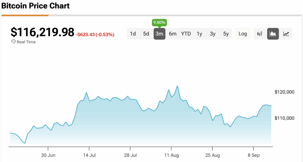 현재 비트코인 가격은 116,219.98달러에 거래되고 있다.