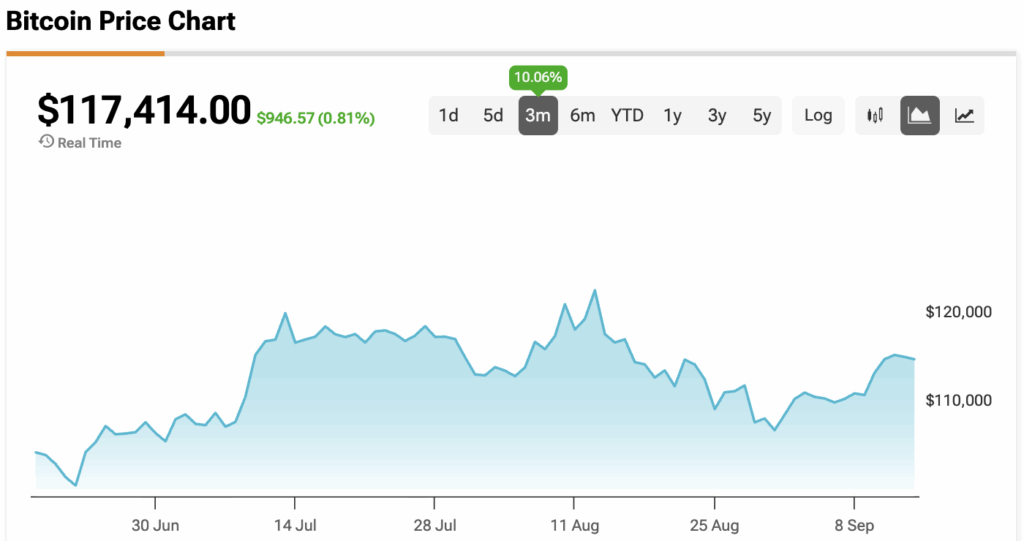 현재 비트코인은 117,414달러에 거래되고 있다.