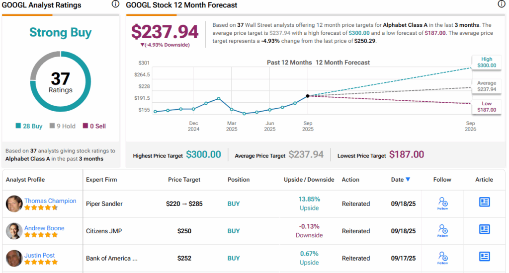 27명의 다른 애널리스트들이 챔피언과 함께 강세 진영에 합류했으며, 9명의 보유 의견이 강한 매수 컨센서스 등급을 훼손하지 못하고 있다. 다만 평균 목표주가 237.94달러는 12개월간 5% 하락을 반영한다. 다른 애널리스트들이 곧 목표주가를 업데이트하거나 등급을 하향 조정할지 지켜보는 것이 흥미로울 것이다. (GOOGL 주가 전망 보기)
