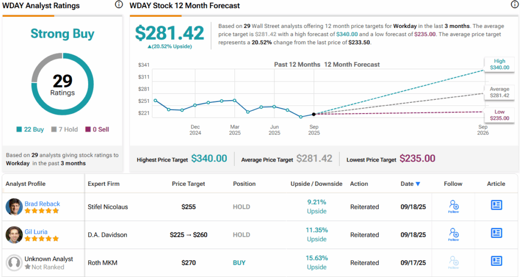 WDAY 주식에 대한 최근 애널리스트 리뷰는 29건이 기록되어 있으며, 매수 22건, 보유 7건으로 구성되어 강한 매수 컨센서스 등급을 형성하고 있다. 이 주식은 현재 233.50달러에 거래되고 있으며, 평균 목표주가인 281.42달러는 향후 12개월간 20.5%의 상승을 시사한다. (WDAY 주가 전망 참조)