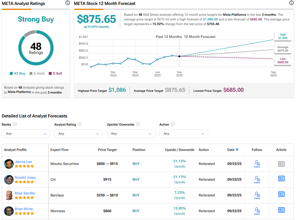 현재 월가는 42개 매수와 6개 보유를 바탕으로 메타 플랫폼스 주식에 대해 강력 매수 합의 등급을 매기고 있다. 평균 META 주가 목표 875.65달러는 15.9%의 상승 여력을 시사한다.