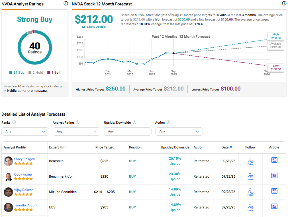 37개 매수, 2개 보유, 1개 매도 추천으로 엔비디아 주식은 월가의 강력 매수 합의 등급을 받았다. 평균 NVDA 주가 목표 212달러는 현재 수준에서 약 18.8%의 상승 여력을 시사한다.