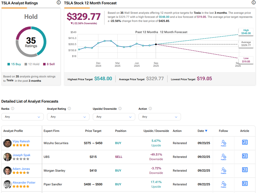 현재 월가는 15개 매수, 12개 보유, 8개 매도 추천을 바탕으로 테슬라 주식에 대해 보유 합의 등급을 매기고 있다. 평균 TSLA 주가 목표 329.77달러는 현재 수준에서 22.6%의 하락 가능성을 시사한다.