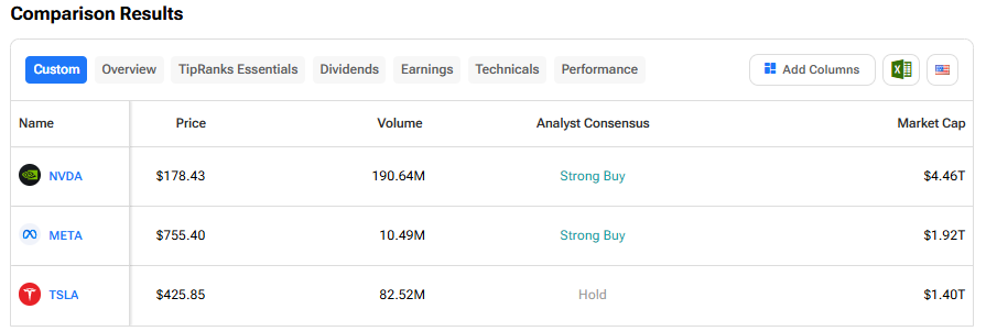 매그니피센트 7 종목들 ? 알파벳 (GOOGL), 아마존 (AMZN), 애플 (AAPL), 메타 플랫폼스 (META), 마이크로소프트 (MSFT), 엔비디아 (NVDA), 테슬라 (TSLA) ? 는 시장 지배력, 혁신, 나스닥 종합지수와 S&P 500 (SPX) 지수에 대한 영향력으로 유명한 주요 기술 기업들이다. 팁랭크스의 주식 비교 도구를 사용해 엔비디아, 메타 플랫폼스, 테슬라를 비교 분석하여 월가 애널리스트들이 보는 이 세 종목 중 최고의 매그니피센트 7 종목을 찾아봤다.
