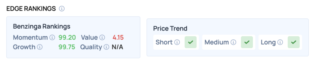 벤징가 엣지 평가에 따르면 IREN은 성장성 99.75점, 모멘텀 99.20점의 우수한 점수를 받았으나, 가치 점수는 4.15점으로 낮게 나타났다.