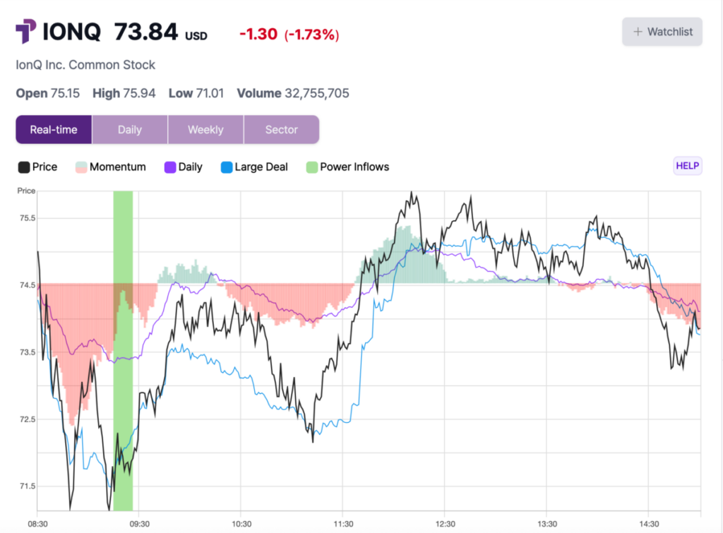 아이온큐(IonQ Inc, NYSE: IONQ)가 기관과 개인 주문 흐름 데이터를 추적하는 트레이더들이 주목하는 주요 지표인 파워 인플로우(Power Inflow) 신호가 포착되며 강세를 보였다.