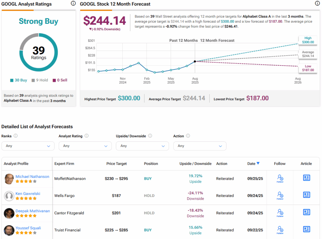 월가를 살펴보면, 지난 3개월간 매수 30개, 보유 9개 의견을 바탕으로 한 애널리스트들의 알파벳에 대한 합의 등급은 '적정 매수'다. 이와 함께 GOOGL 주가 목표가 평균은 244.14달러로, 주가 하락 여력이 0.92%임을 나타낸다.